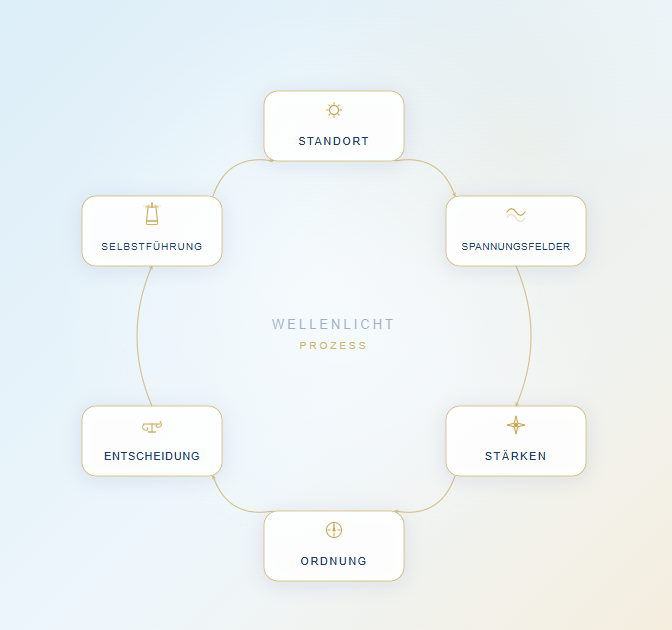 Der Wellenlicht-Prozess führt in vier Schritten von der Bestandsaufnahme zur tragfähigen Entscheidung: Standort klären. Ordnung in die Spannungsfelder bringen. Entscheidungen mit Substanz treffen. Selbstführung als Fundament verankern.